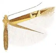 Male, female. Forewing length 4.8 mm. Head: frons shining ochreous with greenish and reddish reflections, vertex, neck tufts and collar shining pale bronze brown with strong golden gloss and greenish reflection; labial palpus, first segment very short, white, second segment three-quarters of the length of third, grey with white longitudinal lines laterally and ventrally, third segment white, lined dark greyish brown laterally; scape dark bronze brown with a white anterior line, ventrally white, antenna dark bronze brown, beyond two-thirds a white ring of two segments, followed towards apex by fourteen dark bronze brown and five white segments at apex. Thorax and tegulae shining pale bronze brown with strong golden gloss and greenish reflection. Legs: dark grey, foreleg with a white line on tibia and tarsal segments one, two and five, segment three white in basal half, tibia of midleg with an oblique indistinct white dorsal line in the basal half and a white apical ring, tarsal segment one dorsally whitish, segment five entirely white, tibia of hindleg with white oblique basal and medial lines and a white apical ring, tarsal segment one dorsally whitish and with a white apical ring, segment two with a white apical ring, segment five entirely white, spurs white dorsally, dark grey ventrally. Forewing above fold and in the apical area shining bronze brown with a strong reddish golden gloss, below fold shining pale golden with greenish and reddish reflections, a pale yellow transverse fascia beyond the middle, narrowing towards dorsum, bordered at the inner edge by a pale golden metallic fascia, perpendicular at dorsum, bordered at the outer edge by a broad, slightly outward oblique similarly coloured fascia, widest on dorsum, both fasciae with some pale reddish reflection, in the middle of the transverse fascia a broad blackish-brown streak with strong reddish gloss, the inner fascia with some irregular dark grey or blackish brown lining on the outside, the outer fascia lined blackish brown on the inside, the outer fascia costally edged by a short and narrow white costal streak, the apical line as a pale golden metallic streak on dorsum of the apical area and ending just before apex, cilia bronze brown around apex, paler towards base, hindwing brownish grey with greenish gloss, cilia greyish brown. Underside: forewing shining greyish brown, hindwing brownish grey. Abdomen shining brown, laterally shining grey with greenish reflection, ventrally yellowish white, anal tuft whitish, mixed grey.[1]