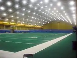 Cost Sports Center is 62 feet (19 m) high and houses a regulation football field that can be converted into nine tennis courts or four indoor soccer fields.[3] It features locker room facilities and a catwalk for filming or viewing practices.[1] Originally the primary indoor practice facility for the University's football team,[4] since 2000 the football program has taken up primary residence at the UPMC Sports Performance Complex on Pittsburgh's South Side just across the Monongahela River from Pitt's campus.[5] Prior to the opening of the UPMC Sports Performance Complex, the Cost Sports Center was also occasionally used by the Pittsburgh Steelers as an indoor practice facility.[6][7] The Cost Center currently serves as an indoor practice facility for the Panthers' varsity baseball, softball, soccer, and track and field teams during inclement weather.[8][9] It also is the site of the annual Blue and Gold inter-squad track and field meet.[10] The baseball team has utilized it for workouts, batting practice, and to host winter Diamond Baseball Clinics,[11] but has moved some activities into its new facilities across the street at the Petersen Sports Complex. The Cost Sports Center is also used by other varsity and club sports, as well as for intramural activities.