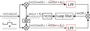 In the simplest case . Therefore, does not affect the input of the noise-reduction filter. The carrier and voltage-controlled oscillator (VCO) signals are periodic oscillations with high-frequencies . The block is an analog multiplier.