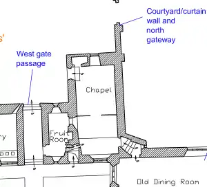 Piers Edgcumbe inherited Cotehele House in 1489. He married Joan Durnford in 1493 and she died in 1521. He remarried in 1525. Two important altarpieces commemorate the union of Edgcumbe and Durnford, so it is likely that the building work on the chapel was carried out during the early years of their marriage from 1493 onward. The alcove that houses the clock was added into the west wall of the chapel (the plan below has north on the right, so the west wall is at the top of the drawing). The 2004 building report states that the west wall was probably rebuilt during the work carried out on the chapel. It is thus likely that the clock was installed at the chapel between 1493 and 1521, with more probability towards the earlier date.