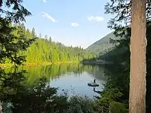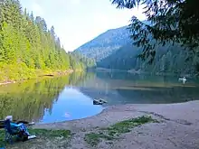 The lake is the fed by Cottonwood Creek, which has its source just south of the lake near Apex Summit at the Highway 6 turnoff for Whitewater Ski Resort.[2] The headwaters of the Salmo River are only a few metres away from that of Cottonwood Creek, which flows to the south to the Pend d’Oreille River.[3]