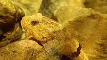 The species is sometimes found in caves, but such individuals generally resemble the aboveground population and may only be occasional visitors.[8] An apparently cave-adapted individual that lacked pigmentation but had normal eye-size has been reported from a cave in West Virginia.[9] Other better-known cave-adapted (in both pigmentation and eyes) populations from Missouri were formerly included in this species, but recognized as a separate species, the grotto sculpin (C. specus), in 2013.[10]