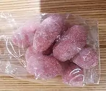 A coucougnette is a confection made with almonds, marzipan and chocolate.[1] The sweet consists of a whole roasted almond coated in dark chocolate, rolled in a mix of crushed almonds, cane sugar, ginger brandy and Armagnac. Each coucougnette is dipped in raspberry juice, resulting in a pink colour.