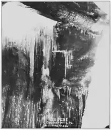The Coudersport Ice Mine is an ice cave located in Sweden Township, Pennsylvania, (east of Coudersport) that forms icicles in the spring and summer but not in the winter. Ice formations appear in the shaft during the spring of the year, continue through the hot weather, and disappear in winter. Ice appears in various shapes and forms, often as huge icicles measuring from 1 to 3 feet (0.91 m) in thickness, and from 15 to 25 feet (7.6 m) in length; the ice is generally clear and sparkling.