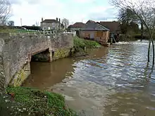 There were two corn mills and a malt mill recorded on the site in 1534.[11] The corn mill was modernised in 1910, with the wheel being replaced by a water turbine and the grindstones being replaced by steel rollers. An engine house was built in 1919 to provide supplementary power for when there was little water in the river, and a second turbine was added in 1922.[11] The mill was destroyed by fire in 1923, and an unattractive steel-framed concrete building replaced it.[12][13][14]