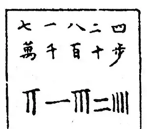 - Chinese Wikisource 孫子算經: 先識其位,一從十橫,百立千僵,千十相望,萬百相當。