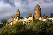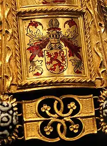 The former counts of Limburg were a branch of the House of Berg, which was among the most powerful dynasties in the region of the lower Rhine during the Early Middle Ages. Historians by name among others Oedinger, Lewald, Kimpen, Rudiger link this House to "Hermann II(I) Pusillius (945–996)" heir of an even older dynasty, the Ezzonen, going back to the 9th century.[1] Since the 9th century, the house of Limburg Hohenlimburg counted five Counts Palatine of Lothringia, several Dukes of Westphalia, Bavaria, Carinthia and Swabia, seven Archbishops of Cologne, one Prince-Bishop of Speyer, more than ten bishops in the Holy Roman Empire, and at least two saints of the Catholic Church. The territorial authority of the family, (counts of Berg since 1077), next counts of Altena and Isenberg and then since 1246 counts of Limburg, was significantly reduced following the opposition of Frederick II, count of Isenberg to the aggression of his cousin, the Archbishop of Cologne, Engelbert II of Berg. Leading to the murder of the latter. The other branch, the counts of the Marck, later rose in importance as dukes of Cleves, Jülich and Berg, dukes of Nevers and Bouillon, counts of Schleiden, etc.