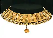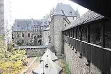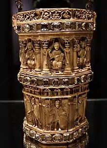 Hermann II, also known as Pusillus, Count Palatine of Lothringen, was count of the Auelgau, Bonngau, Keldacha and Zulpichgau. He fought in the battle of Lechfeld 955. Pusilus, married around 985 for the second time N.N. and died 16 July 996.[5] Two sons are known from that marriage, Herman (III), Count of Keldachgau and Adolf I, defensor Tuitiensis guardian of Deutz.[6] Both mentioned in charters between 1003 and 1041. Adolf I, fifth and youngest son of Herman II was also mentioned Advocadus. On the river Duhn, in the middle of the former Ezzoner Keldachgau, about 30 km east of Cologne, Adolf built castle Berg near today's Altenberg. He was the youngest (half-brother) of Ezzo, founder of Brauweiler Abbey, who was brother-in-law of Emperor Otto III, married to Mathilde. She was brought up by her older niece Abbess of the monastery of Essen, who also named Mathilde . The famous Mathilde cross, kept in the Abbey Essen, is a reminder of her. Adolf in turn was a brother-in-law of the youngest Mathilde, Abbess of Essen. The Ezzoner Adolf I is the direct ancestor of the later Counts and Dukes of Berg. He was followed by his son Adolf II mentioned in charters in 1041, count in the Keldagau en Bruckterau.[7] Married a daughter of count Heinrich II of Westphalia and died approx. 1091. Their son Adolf III called himself Count of Monte (Berg)[8] He is known as Adolf I of Berg, mentioned in charters 1077–1082 Vogt in Gerresheim, Werden, Deutz and Berg.[9] He married a daughter of count Dietrich I of Cleve and died approx 1082. With him the house of Berg starts.