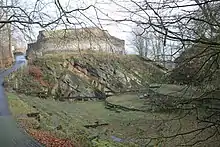 Frederik's sons Diederick of Isenberg, (1215–1301) and Frederik junior who died as a teenager, were brought up at the ducal court by their uncle Hendrik. At a young age they fought with the support of knights of their uncle to reclaim lost property. Diederick built a wooden fort and nearby a stone castle as a support point on the Schleipenberg (near Hagen Germany), the castle Hohenlimburg named after his mother's family. In 1241–1242 he built a second castle New Isenberg opposite the town of Werden on the river Ruhr. On May 1, 1243, he was formally recognized as count of part of his father's recaptured territory. Until then he call himself 'Van Isenberg' later on Diederick I of Limburg (1215–1301). Of Diederick's sons, the eldest son Johan died at the age of thirty and left two sons and one daughter. He is the ancestor of the lords of the territory of Stirum ('Heren van Limburg Styrum').)[17] His younger brother Everhard continued 30 years more, the struggle together with his father for the conquest of former Isenberger family property.