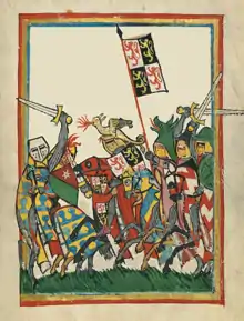 They came into a difficult position when Diederick's nephew, Duke Walram V of Limburg, died in 1280. The Limburg Succession War (1283–1288) around the Duchy of Limburg erupted in fury. At Battle of Woeringen Saturday 5 June 1288, just north of Cologne on the river Rhine, the Duke of Brabant and his allies defeated Van Mark, Gulik-Loos, Bergse sergeants and Cologne civilians in a devastating battle of the Cologne Archbishop Siegfried van Westerburg with allies, Gelre, Valkenburg and Kur-keulen sergeants. Diederick of Limburg with son Everhard did not personally participate, but did support the Cologne archbishop. As a result, great-nephew Count Everhard of the Mark, who had sided with Duke Johan I of Brabant and was one of the victors, destroyed the Neuen Isenberg and took and occupied the Hohenlimburg.[18] Diederik, Everhard and family members fled to their castle Styrum (near present-day Oberhausen), where Diederik died in 1301 at an (for that time) very old age.