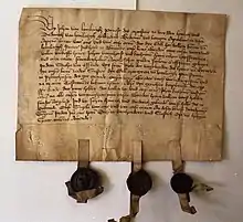 Count Johan (III) had only two close cousins Dietrich and Adolf, sons of his godfather Johan (II) of Limburg (1421–1472).[21] Their uncle Count Hendrik determined that they were joint heirs. They were appointed as Wiltforster and Holzgraf of the Saarner forests, part of the county of Limburg Broich. Their father Johan, former provost of the Benedictine monastery Werden, was count Hendrik's brother. After 30 years in office, Johan left the monastery and married Anna Borckhartz zu Schenkenbush. This marriage took place under the testimony of the mayor Jacob Borken, brother counsel Johannes Borken and magistrate Rutger of Galen called Halswic of the city of Essen. At that time it was a legal but not equal marriage. Anna's family had their estate Schenkenbusch on loan from the abbey, some family members belonged to the city council of Essen. But they did not come from a noble family. The marriage was kept secret until 1553. That year on April 22, the lawyer Dr. Johan Amerdinck handed over an official deed to the abbot of Werden, Herman of Holthe, on the basis of which the legitimate right of inheritance was claimed by Willem of Limburg grandson of provost Johan.[22] That was confirmed and accepted by the abbot. Before the end of the 16th century, these last patrilineal descendants of the former counts of Limburg Hohenlimburg left Germany during the devastating Thirty Years' War (1618-1648), for the Netherlands and settled in Gelderland. The current members of this last family branch "Van Limburg" still living in the Netherlands, some abroad.