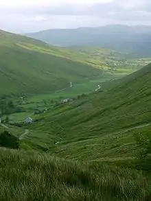 The forested area in the county extends to 55,534 ha (137,228 acres), the 4th highest total forest cover in Ireland.[25] Historic deforestation left Donegal devoid of forest cover by 1900. Much of the county's forests are commercial timber plantations which were initially established in the 1930s as a way to create rural employment in areas with poor agricultural land and high rates of emigration.[26] The county contains extensive tracts of blanket bog which are concentrated in western and upland regions. Blanket bog covers an area of 148,656 ha (367,337 acres), or roughly 30 percent of the entire county.[27]