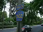 County Route 502 Truck is a bypass of a section of CR 502 in Ho-Ho-Kus, New Jersey. The route travels 0.75 miles, following part of CR 77 and CR 507. It was designated so that trucks could detour around a section of CR 502 westbound where trucks have been banned due to a steeply graded intersection. CR 502 Truck, while signed, is not an official route, and it has no publicly available straight line diagram.[5] However, its length may be determined by utilizing the straight line diagrams for CR 77 and CR 507.