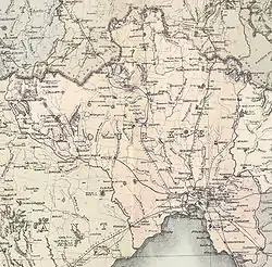 The County of Bourke is one of the 37 counties of Victoria which are part of the Lands administrative divisions of Australia, (used for land titles and no longer other administrative or political function). It is the oldest and most populous county in Victoria and contains the city of Melbourne. Like other counties in Victoria, it is subdivided into parishes. The county was named after Irish born Sir Richard Bourke, the Governor of New South Wales between 1831 and 1837.[1] It is bordered by the Werribee River in the west; the Great Dividing Range in the north; Port Phillip in the south; and by Dandenong Creek, a small part of the Yarra River, and the Plenty River in the east. The county was proclaimed in 1853.