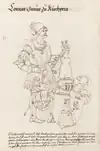 - Conrad of Kirchberg: Konrad is shown on the miniature 24r of the Codex Manesse as a knight (Graue Chunrat vo Kilchberg) who is giving his beloved a poem on horseback. 22 stanzas have survived, divided into three summer and three winter songs, which are reminiscent of Neidhart and Tannhäuser in terms of motif and form.[8] The historical person is uncertain; it is either Konrad (documented between 1255 and 1268) or his son of the same name (documented between 1286 and 1315).[8]