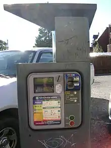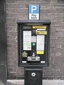 A pay and display machine is a type of ticket machine used for regulating parking in urban areas or in car parks. It relies on a customer purchasing a ticket from a machine and displaying the ticket on the dashboard, windscreen or passenger window of the vehicle. Details included on a printed ticket are generally the location and operator of the machine, expiry time, fee paid and time entered.