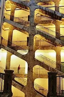 The Cour des Voraces, also called Maison de la République, is a courtyard building in the Pentes quarter, in the 1st arrondissement of Lyon, famous for its enormous six-floor stairway. It is an impressive traboule, a covered passage with entrances on Place Colbert, Montée Saint-Sébastien and Rue Imbert-Colomès.[1]