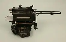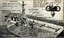 In 1916, Harry Wimperis started the design of a new bombsight, working in collaboration with Scarff.[1] This new Drift Sight included a simple system that greatly eased the measurement of the wind. By observing their movement over the ground, the aircraft would first determine the direction of the wind. The aircraft would then turn to fly at right angles to this wind direction so that the wind was pushing the aircraft sideways. Observing the sideways drift of the aircraft by comparing the motion of objects on the ground to a metal rod along the side of the bombsight, the drift could be seen. Using a knob, the rod was angled away from the side of the aircraft until objects could be seen moving directly along the line of the rod. A gear in the knob that adjusted the rod angle also drove the sights fore or aft, moving them to account for the wind speed. This eliminated the need for a stopwatch to measure the ground speed. However, the Drift Sight was still useful only for bomb runs along the wind line.[5]