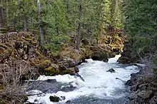 Soon the river receives Wizard and Copeland creeks from the left and passes under Oregon Route 230, which continues roughly parallel to the river along the left bank. Next, Foster and Prairie creeks enter from the left, Bridge, and Brown creeks from the right, and Bybee and Castle creeks from the left. NFD 6510 crosses the river between the latter two creeks, and Route 230 ends shortly thereafter where it meets Oregon Route 62, also known as the Crater Lake Highway. This highway continues roughly parallel to the river on its left bank. Turning southwest at Farewell Bend Campground, on the right at RM 188 (RK 303), the river enters Rogue River Gorge, receiving Union Creek from the left near the unincorporated community of Union Creek and the Union Creek Historic District and Flat Creek from the right shortly thereafter. Below Flat Creek, the Upper Rogue River Trail crosses the river on a footbridge at RM 185 (RK 298), just above Natural Bridge Campground and Natural Bridge. Passing over a waterfall about 1 mile (1.6 km) later, the river passes under Woodruff Bridge, which carries Abbot Creek Road, at the Woodruff Bridge Picnic Area, which lies to the left. The river receives Abbott Creek from the right shortly thereafter and turns south. The stream then flows through Takelma Gorge and passes River Bridge Campground, which is on the left. At this point, NFD 64 crosses the river. Between here and the unincorporated community of Prospect at about RM 172 (RK 277), the river receives Kiter, Latson, Deep, Lund, Graham, and Schoolma'am creeks, all from the right. At Prospect, the river enters a reservoir behind a diversion dam that receives water from a canal on the left and releases water via a canal on the right to hydroelectricity projects. Below the dam, Route 62 and, shortly after, Mill Creek Drive, cross the river and continue parallel to it along the right bank.[7][11] The average stream gradient over the 43 miles (69 km) between the headwaters and Prospect is very high, about 62 feet per mile (12 m/km).[12]