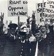 The military had already witnessed increasing GI resistance to the war within their ranks. Prior resistance had been individual, like Army Captain Howard Levy's refusal to train Green Berets, or sporadic group actions like the Fort Hood Three, who collectively refused orders to combat, and the Fort Hood 43, who refused orders to deploy to the 1968 Democratic National Convention in Chicago for riot-control duties. The October demonstration in San Francisco contained a larger contingent of active duty GIs than ever before in an anti-Vietnam war demonstration, and several of them marched, spoke and gave press conferences in uniform.[9] Then at the end of the march, a group of four AWOL soldiers turned themselves in to the military and were confined in the Army's military prison at the Presidio. The Army quickly regretted this when the four met with the other prisoners over the weekend, who were already angry over the horrible prison conditions and the recent guard murder of a fellow prisoner, and convinced them to participate in a protest over prisoner conditions and against the war. On October 14, 27 prisoners staged a sit-down protest which became known as the Presidio mutiny, one of the largest early instances of internal military resistance to the Vietnam War.[14]
