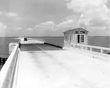 Costing $900,000 in total, the Davis Causeway was opened on January 28, 1934 with a 25¢ toll per car. At the time of its completion, the Davis Causeway was the longest over-water fill across an open body of water in the United States.[2] Soon after the Davis Causeway opened, agitation began to have the State Road Department to purchase it and remove the toll. Unlike the battle over the acquisition of the Gandy Bridge between Tampa and St. Petersburg, the owners of Davis Causeway remained realistic concerning the probability of the state acquiring their investment. However it wasn't until 1944, as part of the war effort, that the federal government obtained the Davis Causeway, paying its previous owners $1.085 million, with the Public Works Administration paying half and the State Road Department paying the remainder. The ownership of the causeway was transferred to the state of Florida.[3]