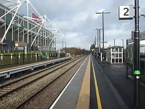 Coventry Arena railway station is a railway station on the Coventry-Nuneaton Line. Located to the north of Coventry, England, it serves the adjacent Coventry Arena, for which it is named. It was opened on 18 January 2016, along with Bermuda Park station[1] after considerable delays.[2][3]