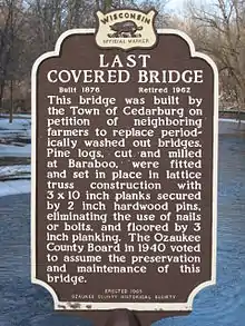 - "Last Covered Bridge (Built 1876, retired 1962) (Historic Marker Erected 1965)". Wisconsinhistory.org. Retrieved July 22, 2012.