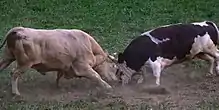 Bull wrestling, cow fighting or bull fighting is a non-lethal bloodsport between bulls or cows found in some parts of the world.