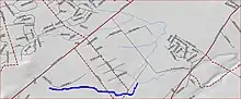 The Cow Yard Brook starts at 40°24′43″N 74°32′8″W[1] near the intersection of Beekman Road, Northumberland Way, and US Route 1. It crosses Deans Lane near its intersection with Black Horse Lane. It then crosses Black Horse Lane and drains into the Oakeys Brook at 40°24′46″N 74°30′51″W,[1] near the intersection of Black Horse Lane and Henderson Road.