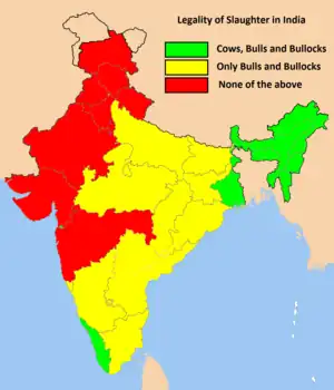 The BJP government have introduced some restrictions on the slaughter of cattle. The slaughter of cattle for export was banned in May 2017. This restriction threatened an Indian beef export industry worth $4 billion annually.[13] Several Indian states further restricted the slaughter of cows. For example, Maharashtra passed stricter legislation banning the possession, sale, and consumption of beef in March 2015.[11] Cow vigilantes have also been emboldened by these laws, and attack Muslims suspected of smuggling cattle for slaughter.[11][31]
