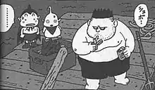 Paifu's mother later tells him that school has been canceled for a while due to the serious flu.[10] He celebrates by going to José's home and runs into the village doctor. The doctor realizes that the flu strain is the Monster Flu (お化け風邪, Obake Kaze), a disease that affects only monsters and kills the victim in a month's time.[11] When the two arrive at the Rodriguez residence to see José's ill father, the doctor's suspicions are confirmed to everyone there and reveals that the cure to the Monster Flu can be created by a witch that resides at the top of Horned-Owl Mountain.[12] The doctor also tells of a forest that one must cross and that a terrible monster dwells along the forest path which leads to the mountain. Due to the adult monsters being sick, Paifu and José volunteer to make the trip and are accompanied by the former sumo wrestler Maruyama, who in actuality, was deceived by Paifu who claimed that the villagers would pay him 1,000,000 yen for his troubles.[13] As the trio are about to leave, Arpon joins the team, exclaiming that he wants to be a hero for the villagers.[14]