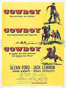 Cowboy is a 1958 American Western film directed by Delmer Daves and starring Glenn Ford, Jack Lemmon, Anna Kashfi and Brian Donlevy. This film is an adaptation of the Frank Harris semi-autobiographical novel My Reminiscences as a Cowboy. Lemmon's character is based on Harris. The opening animated title sequence was created by Saul Bass. The screenwriters were Edmund H. North and Dalton Trumbo - the latter received no screen credit at the time because he had been blacklisted as one of the Hollywood Ten.[2]