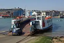 The current vessel Floating Bridge No.6 was built by Welsh boat builders Mainstay Marine. It has an expected lifespan of 40 years and around twice the carrying capacity of the previous vessel, Floating Bridge No.5. It was installed on the Isle of Wight on 3 May 2017.[16] Despite delays, the vessel's maiden voyage took place 10 days later on 13 May 2017.[17] The following day, the vessel broke down due to a power cut, forcing passengers to wade through the River Medina to disembark the ferry. Further problems were caused by the angle of the slipway causing cars to scrape bumpers when loading and unloading from the East Cowes side.[18] On 15 May 2017, the Maritime and Coastguard Agency suspended the service, citing "training issues". The temporary pedestrian launch which had been used after the previous vessel's retirement and the new vessel's installation was re-instated, but vehicles were once again forced to take the 10-mile round trip through Newport.[19] After several months of suspension and intermittent operation, full service resumed in early 2018.