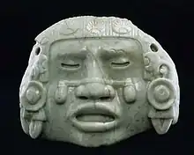 Gold ornaments adorn the face of Coyolxāuhqui in the form of earrings and bell pendants. The ear ornaments are made up of the trapeze-ray sign symbolic of the tail of Xiuhcoatl the fire serpent.[11] Thus, making them identifiers as they create a direct tie to her brother Huitizilopochtli, who used Xiuhcoatl as his weapon.