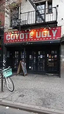 The Coyote Ugly Saloon is an American drinking establishment and the namesake of an international chain of bars, known for its bartenders dancing on the bar. It served as the setting for the 2000 movie Coyote Ugly.