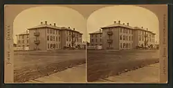 That same day Train bought the lot across the street from the Herndon House and secured a builder for the facility. Asking the builder how much it would cost to make a three-story, 120 room establishment, the builder replied $1,000 a day. Train said, "Show me you are worth it. I will be back to Omaha in 60 days and expect to sleep in the building." The building was finished upon his return.[5] The building was a three-story frame structure in the shape of a T, the front part being 132 feet (40 m) long by 32 feet (9.8 m) wide, and the rear extension is 100 feet (30 m) long and 50 feet (15 m) wide.[6]