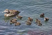 In the Common eider population, after giving birth to their eggs, the mother will incubate them until they hatch.[1] The mothers will hear a signal from the juvenile's which will cause her to move away and open the nest for the eggs to hatch safely.[5] Once the eggs have hatched, the mother will either abandon her young, care for her young alone or join a multi-female crèche.[1] In the common eider species, if the crèche group behaviour is followed, the formation of the crèche will occur as soon as the juveniles leave the nest, and the group behaviour will last for a long period as the mother provides parental care to her young as they develop.[5] Studies have shown that while the parental care mode can change over the years, 46% of female eiders will care for their young through a multi-crèched environment.[1] Female eiders can care for their young through a true crèche or a transient crèche.[1] In a true crèche, the mother will choose a select group of females to live and care for her young with for a long period of time.[1] Contrastingly, in a transient crèche, the female and her young will not stay with the same group for a long duration and they will move through different crèches rather than stay with one permanent group.[1] These transient crèches will normally form about two weeks after the juveniles hatch so they have time to experience social interaction with their mother and siblings first.[6] The females and young in the true crèches showed a higher level of overall condition compared to the transient crèches.[1] Another study provided evidence that common eiders who do not join a crèche will maintain the best condition throughout development compared to those who did.[6]