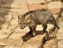 The crab-eating fox (Cerdocyon thous), also known as the forest fox, wood fox, bushdog (not to be confused with the bush dog) or maikong, is an extant species of medium-sized canid endemic to the central part of South America since at least the Pleistocene epoch.[1][2][4] Like South American foxes, which are in the genus Lycalopex, it is not closely related to true foxes. Cerdocyon comes from the Greek words kerdo (meaning fox) and kyon (dog) referring to the dog- and fox-like characteristics of this animal.[5]
