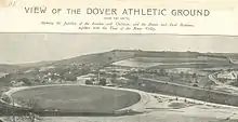 In 1896, a syndicate of local businessmen began a project to create a sports complex at the site known as Crabble Meadows on the outskirts of Dover. The word Crabble, which is also found in the name of a local corn mill,[5] derives from the Old English crabba hol, meaning a hole in which crabs are found.[6] The project was an extremely costly one but was completed in 1897,[7] and football was first played on the Crabble site in the same year.[8] The ground was originally laid out on an 8 acres (3.2 ha) plateau "carved out of the side of the hill"[7] and was originally laid out to cater for cricket and football, with an athletics track and 640 yards (590 m) international standard cycling track around the edge of the playing surfaces.[7][9]