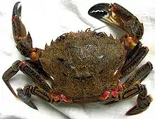 Around 65 species of crab occur in the waters of the British Isles.[1][Note 1] All are marine, with the exception of the introduced Chinese mitten crab, Eriocheir sinensis, which occurs in fresh and brackish water. They range in size from the deep-water species Paromola cuvieri,[3] which can reach a claw span of 1.2 metres (3 ft 11 in),[4] to the pea crab, which is only 4 mm (0.16 in) wide and lives inside mussel shells.