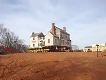 In 2005, Charles Gaddy died, and the land transferred to another development group in 2009.[2] The Crabtree Jones House was scheduled for demolition in 2012.[25] The property, including that on which the house sat, are to be turned into a set of apartment buildings similar to those that have been built recently in other sections of the city. Much of the forest that had covered the remaining one acre property was removed. Fortunately, the nonprofit Preservation North Carolina, with the cooperation of the developer and the local community, was able to move the house off its hill to a nearby 1960s suburban neighborhood that also houses the Jones family cemetery.[2] A key challenge concerning the move was just how exactly the 200-ton house would be transported down a hill of such a steep grade. This was accomplished via the use of computer-controlled hydraulic pumps that kept the house level during its transfer.[25] The move itself had a budget of $632,000, which included placing the house on the steel moving array, transportation, and the purchase and demolition of the existing 1960s ranch home on whose site the Crabtree Jones house was to be placed.[2] The house successfully completed its move on February 4, 2014.[2]