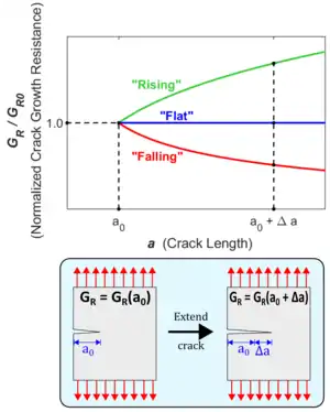 Conceptually can be thought of as the energetic gain associated with an additional infinitesimal increment of crack extension, while can be thought of as the energetic penalty of an additional infinitesimal increment of crack extension. At any moment in time, if then crack extension is energetically favorable. A complication to this process is that in some materials, is not a constant value during the crack extension process.[1] A plot of crack growth resistance versus crack extension is called a crack growth resistance curve, or R-curve. A plot of energy release rate versus crack extension for a particular loading configuration is called the driving force curve. The nature of the applied driving force curve relative to the material's R-curve determines the stability of a given crack.