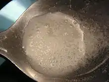 Crack cocaine is frequently purchased already in rock form,[4] although it is not uncommon for some users to "wash up" or "cook" powder cocaine into crack themselves. This process is frequently done with baking soda (sodium bicarbonate), water, and a spoon. Once mixed and heated, the bicarbonate reacts with the hydrochloride of the powder cocaine, forming free base cocaine and carbonic acid (H2CO3) in a reversible acid-base reaction. The heating accelerates the degradation of carbonic acid into carbon dioxide (CO2) and water. Loss of CO2 prevents the reaction from reversing back to cocaine hydrochloride. Free base cocaine separates as an oily layer, floating on the top of the now leftover aqueous phase. It is at this point that the oil is picked up rapidly, usually with a pin or long thin object. This pulls the oil up and spins it, allowing air to set and dry the oil, and allows the maker to roll the oil into the rock-like shape.