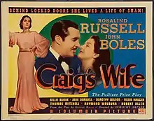 Craig's Wife is a 1936 American drama film starring Rosalind Russell as a domineering wife.[1] It was based on the Pulitzer Prize-winning 1925 Broadway play of the same name by George Kelly (the uncle of Grace Kelly),[2] and directed by Dorothy Arzner. Former MGM star William Haines was the film's production designer. Previously filmed in 1928, Craig's Wife was remade in 1950 as Harriet Craig, rewritten (and updated) as a vehicle for Joan Crawford and co-starring Wendell Corey.