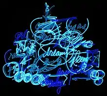 Kraft's combination of rolled aluminum tubing and neon functions well for an outdoor setting, for he is able to use the aluminum to protect the neon's wiring from the elements, whether these pieces are attached to buildings or are freestanding.[11] Some critics have questioned whether neon, a material traditionally associated with nighttime viewing, functions well for public art viewed during the daytime. However other art critics believe that Kraft's most recent neon works, which incorporate aluminum tubes painted in a vibrant powder coating, appear just as bold during the daytime as during the night.