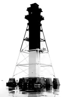 Initially the plan was to use screw-pile lighthouses (shore lights were never considered); ice in the winter of 1872–1873 led them to reconsider this, and the front light was built as a small caisson structure. For the rear light a grid of nine stone piers was laid out, and a pyramidal iron tower was erected. A central shaft of wood timbers sheathed in iron plates held the staircase to the lantern, and a wooden house surrounded this at the base of the light.