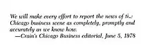 The first newsstand issue of Crain's Chicago Business appeared on Monday, June 5, 1978, a 46-page edition with an exclusive lead story on how the Marshall Field & Co. department store chain was planning further suburban expansion.[2]