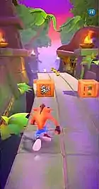 Crash Bandicoot: On the Run! was a runner game in which players controlled either the titular character Crash or his sister Coco, who were tasked with saving the multiverse from domination by Doctor Neo Cortex and his minions.[1] Levels consisted of three-lane paths, in which Crash and Coco ran in perpetuity. Players could control the character's actions by swiping the screen; swiping left or right caused them to switch lanes while swiping up and down made them jump and slide downward respectively. Players could tap on the screen to initiate a spin attack which could be used to destroy crates and enemies.[2][3] Players could collect Wumpa Fruit that were scattered throughout the levels, and the number of steps Crash and Coco take was recorded and accumulated.[4] Mechanics carried over from the main series included Aku Aku masks that protected Crash and Coco from enemies and hazards,[5][6] as well as checkpoint crates that preserved players' progress.[3]