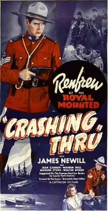 Crashing Thru is a 1939 American northern action film directed by Elmer Clifton and starring James Newill, Jean Carmen and Warren Hull.[1] It is based on the 1935 novel Renfrew Rides the Range, the seventh in the popular Renfrew of the Royal Mounted series by Laurie York Erskine. The film was shot at the Iverson Ranch and on location around Big Bear Lake in the San Bernardino Mountains of California. It was originally intended to be released by Grand National Pictures before being picked up for distribution by Monogram.