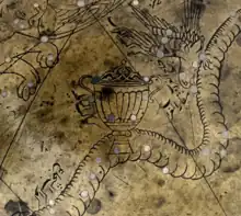 In the Babylonian star catalogues dating from at least 1100 BC, the stars of Crater were possibly incorporated with those of the crow Corvus in the Babylonian Raven (MUL.UGA.MUSHEN). British scientist John H. Rogers observed that the adjoining constellation Hydra signified Ningishzida, the god of the underworld in the Babylonian compendium MUL.APIN. He proposed that Corvus and Crater (along with the water snake Hydra) were death symbols and marked the gate to the underworld.[2] Corvus and Crater also featured in the iconography of Mithraism, which is thought to have been of middle-eastern origin before spreading into Ancient Greece and Rome.[3]